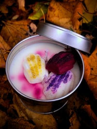 This 2 wick candle has a steel grey container. It is beautifully decorated with hand painted colours and additions that will make the candle burn and extra hour. If wanted these additions can be removed and used as wax melts since they too contain the lovely fragrance perhaps to share with a friend. This is a 7 oz candle or 200 ml candle that will burn for around 50 hours. It spreads the scent well in a smaller room up to around 20 square meters.